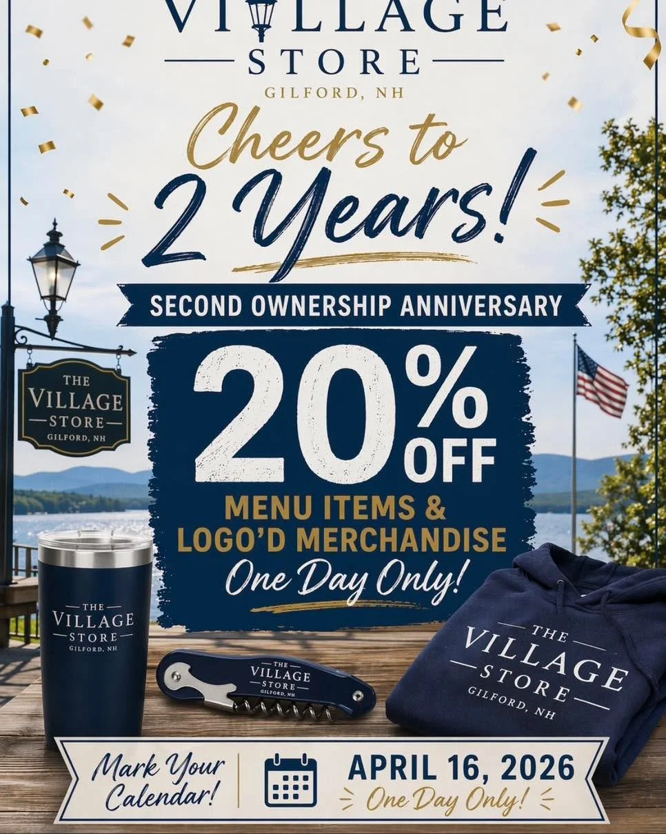 Come check out the Gilford Village Store merch! We have shirts, sweatshirts, hats, and tumblers.